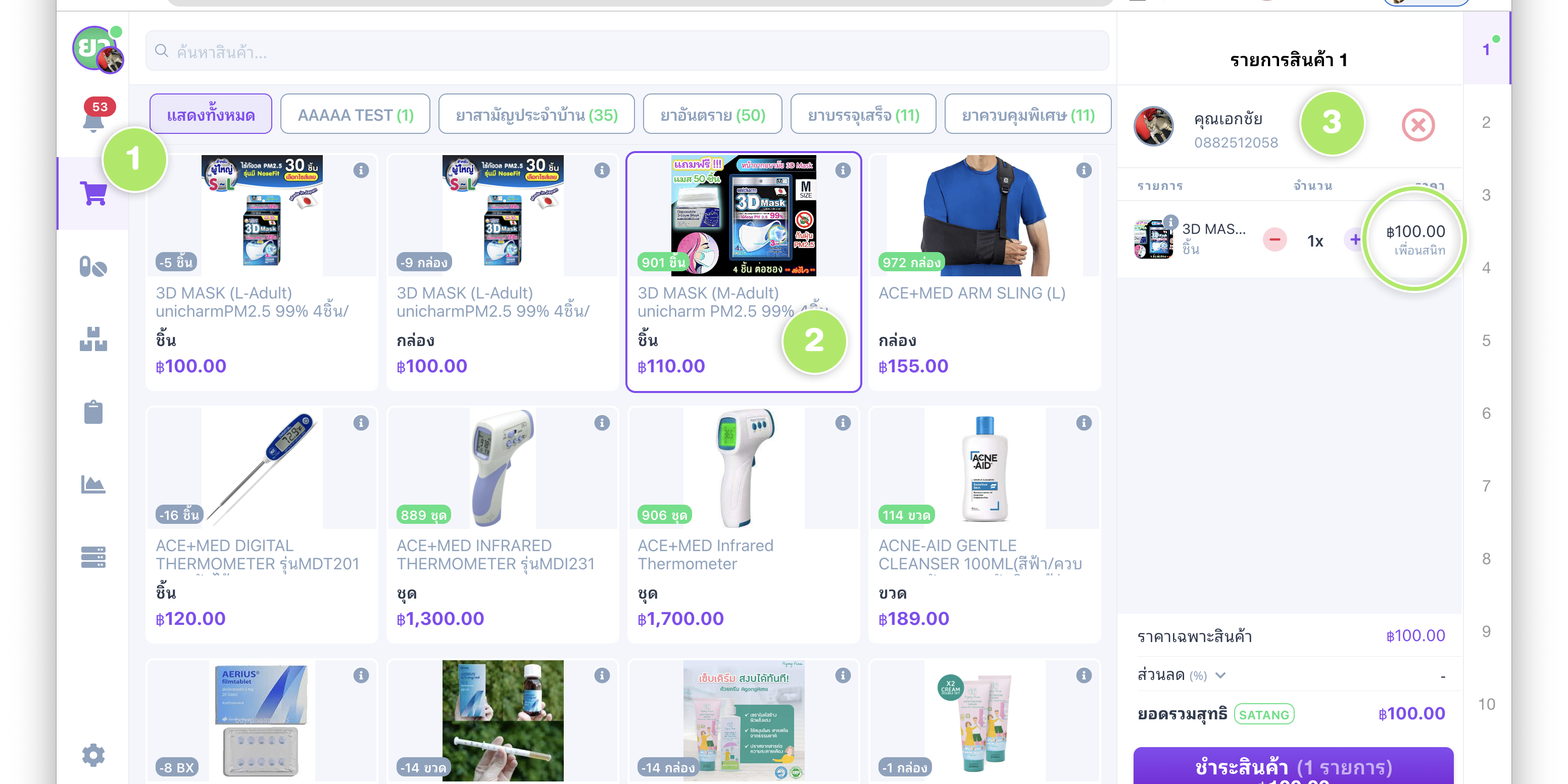 - ขั้นตอนต่อไปจะเป็นการทดสอบการผูกราคาขายสินค้ากับประเภทลูกค้า โดยร้านค้าสามารถทดสอบได้ที่หน้า(1)การขาย POS, (2)เลือกสินค้าที่ได้ดำเนินการตั้งราคาขายใหม่ และ(3)เลือกลูกค้า หลังจากนั้นระบบจะแสดงราคาขายสินค้าที่ได้ผูกกับลูกค้านั้น ๆ ไว้ ในตะกร้าสินค้า