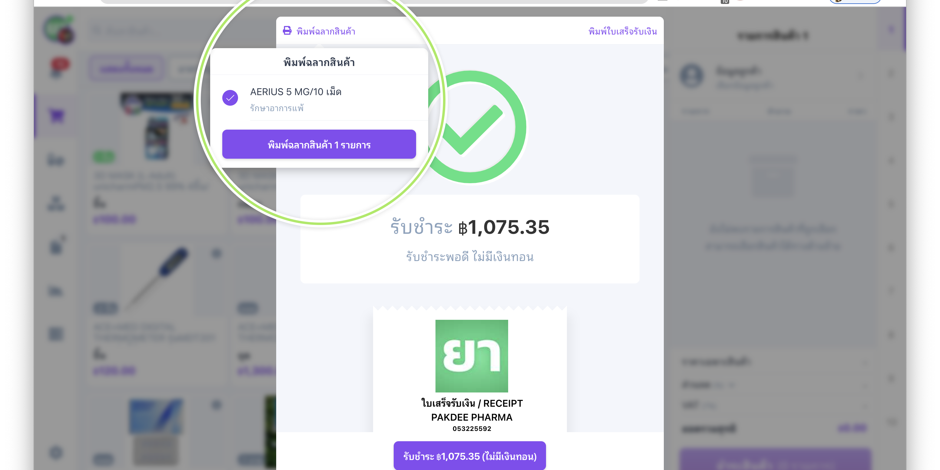 - การพิมพ์หลังชำระค่าสินค้าเรียบร้อยแล้ว (สามารถตั้งค่าพิมพ์ฉลากยาอัตโนมัติได้)