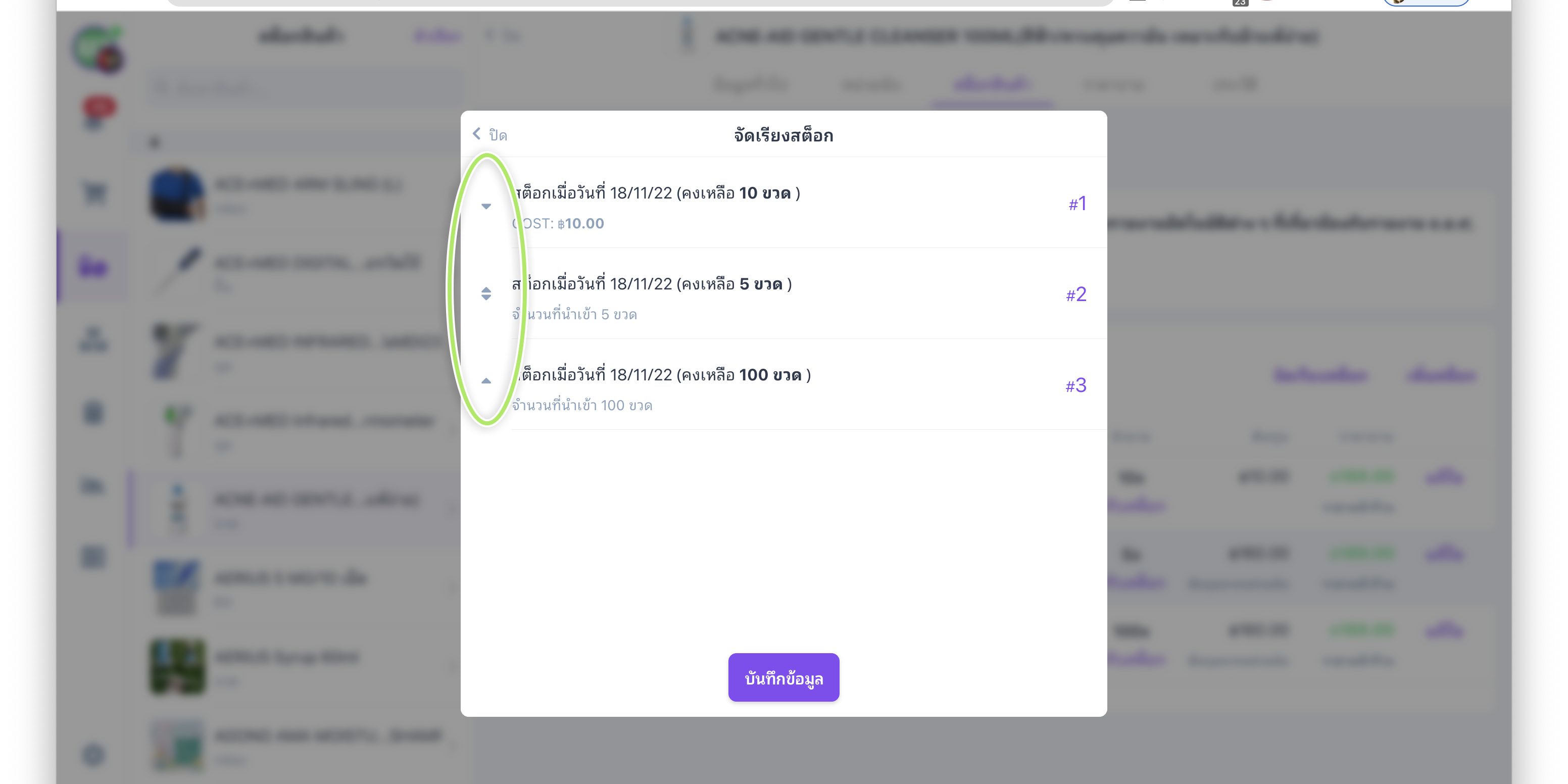 ระบบจะแสดงรายละเอียดรายการสต็อกสินค้าทั้งหมดของหน่วยนับในสินค้านั้น ๆโดยที่ร้านค้าจะต้องเลื่อน/คลิก/ลาก ขึ้น หรือลง ตรงสัญญาลักษณ์ลูกศรที่อยู่ด้านหน้ารายการสต็อกสินค้า เพื่อจัดลำดับ หากจัดเรียงเสร็จแล้ว ร้านค้าต้องกดปุ่ม “บันทึกข้อมูล” เสมอ