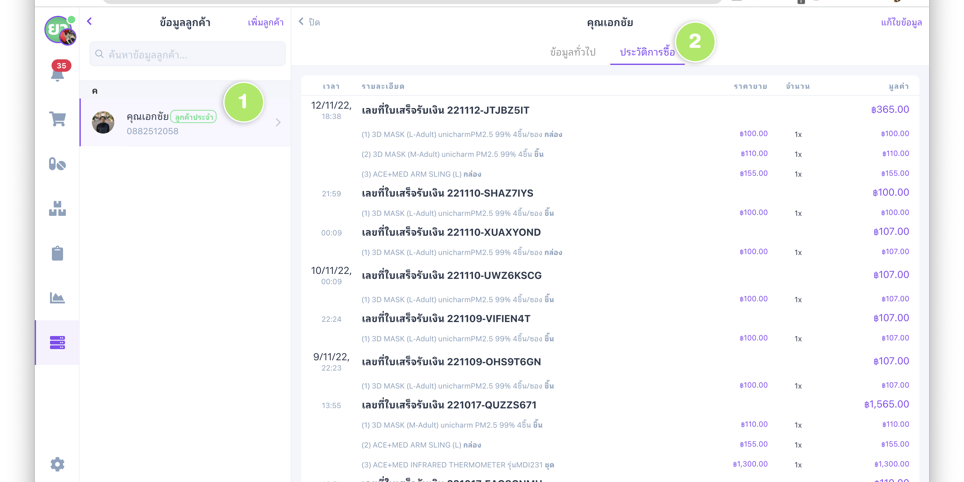 หลังจากเข้าหน้าฐานข้อมูลลูกค้าเรียบร้อยแล้ว ร้านค้าสามารถเลือก(1)ข้อมูลลูกค้าที่ต้องการเรียกดู และเลือกแถบ(2)ประวัติการซื้อ